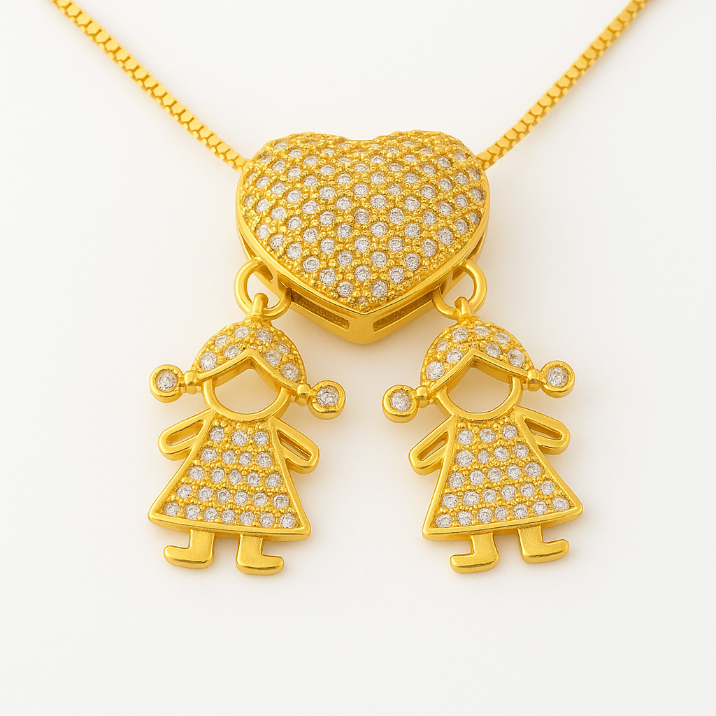 O delicado pingente em formato de coração, cravejado com zircônias reluzentes, simboliza um amor que brilha intensamente. As duas silhuetas de meninas, esculpidas com perfeição, representam suas filhas, netas ou irmãs – uma homenagem eterna ao vínculo mais especial da sua vida.
