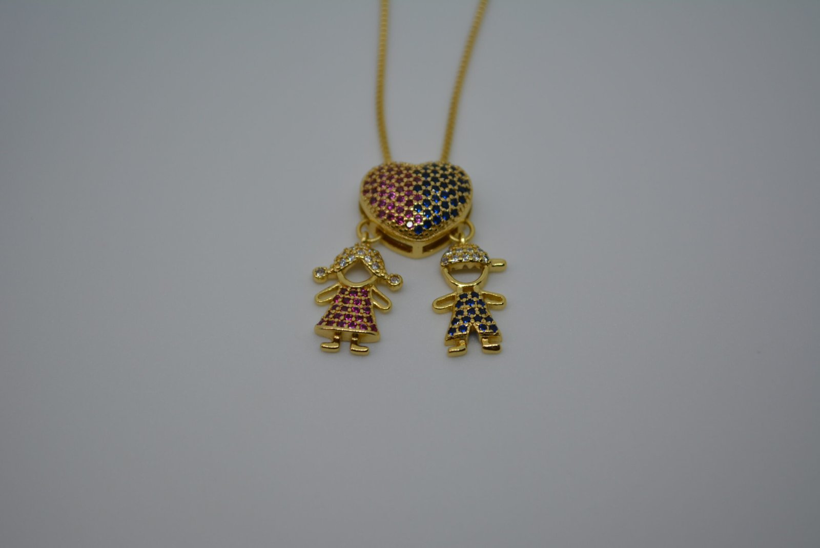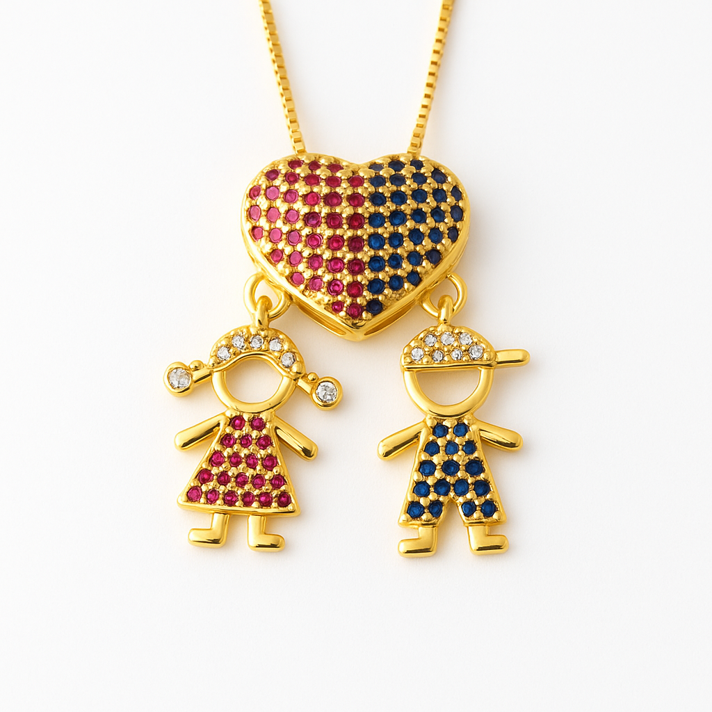 Descubra o Colar Coração Radiante, um acessório sofisticado que representa amor, união e família. O design elegante combina um coração cravejado com pedras coloridas e um casal representando seus filhos ou netos, criando um colar único e cheio de significado.