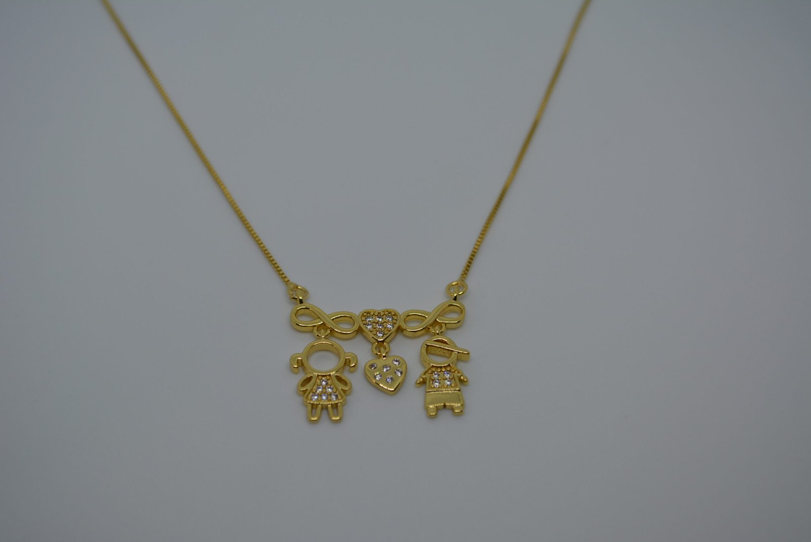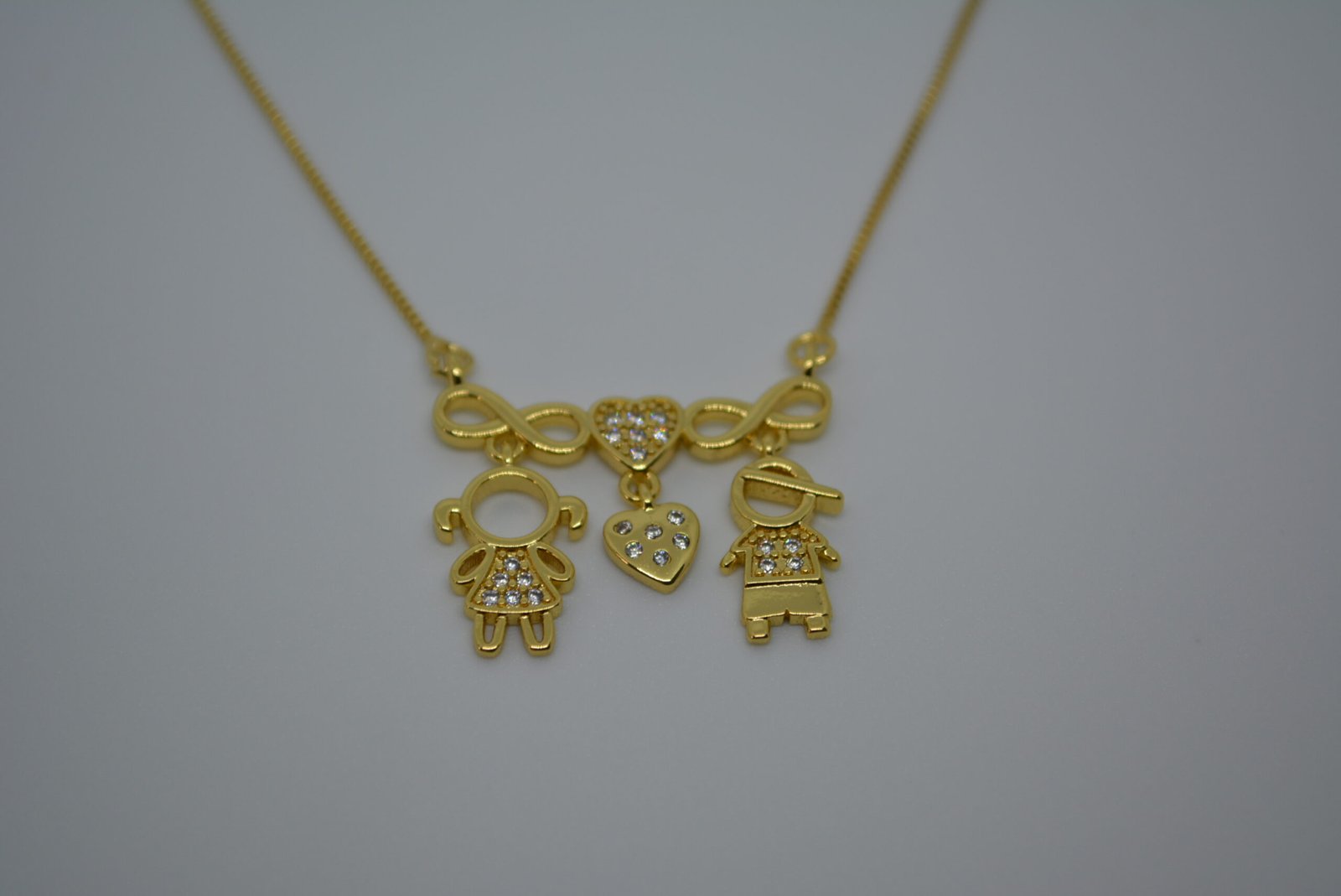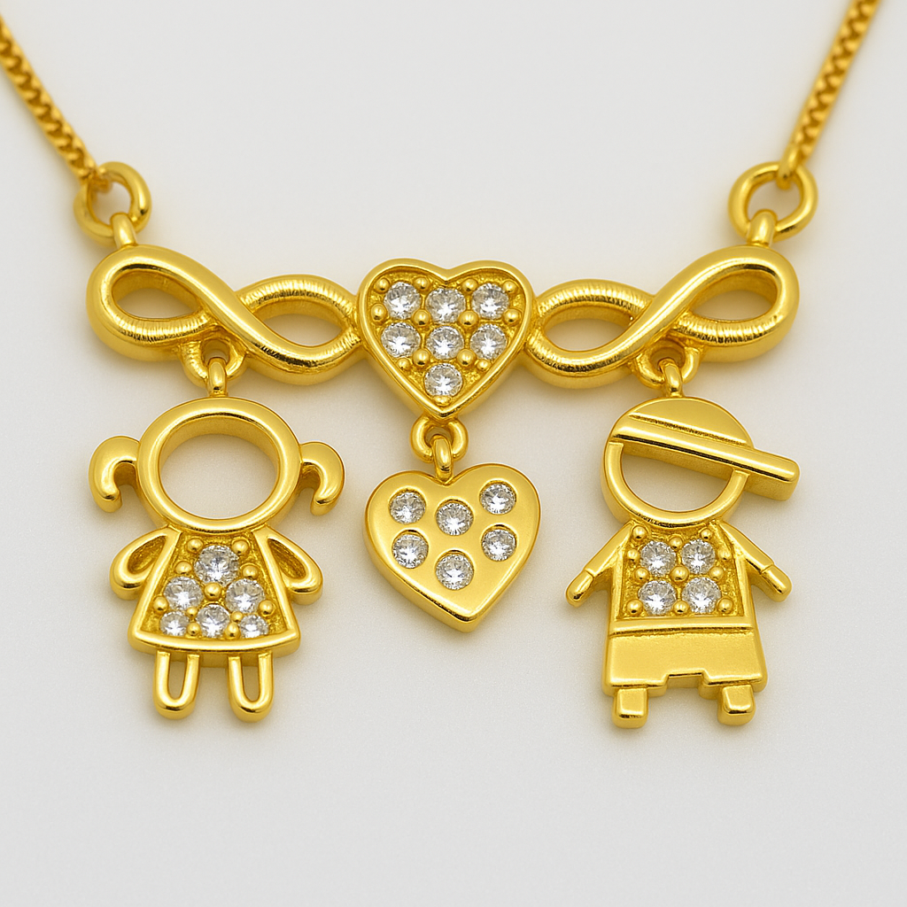 Descubra o Colar Elos infinitos, um acessório sofisticado que representa amor, união e eternidade. O design elegante combina dois símbolos do infinito, dois corações cravejados e figuras estilizadas de casal, criando um colar único e cheio de significado.