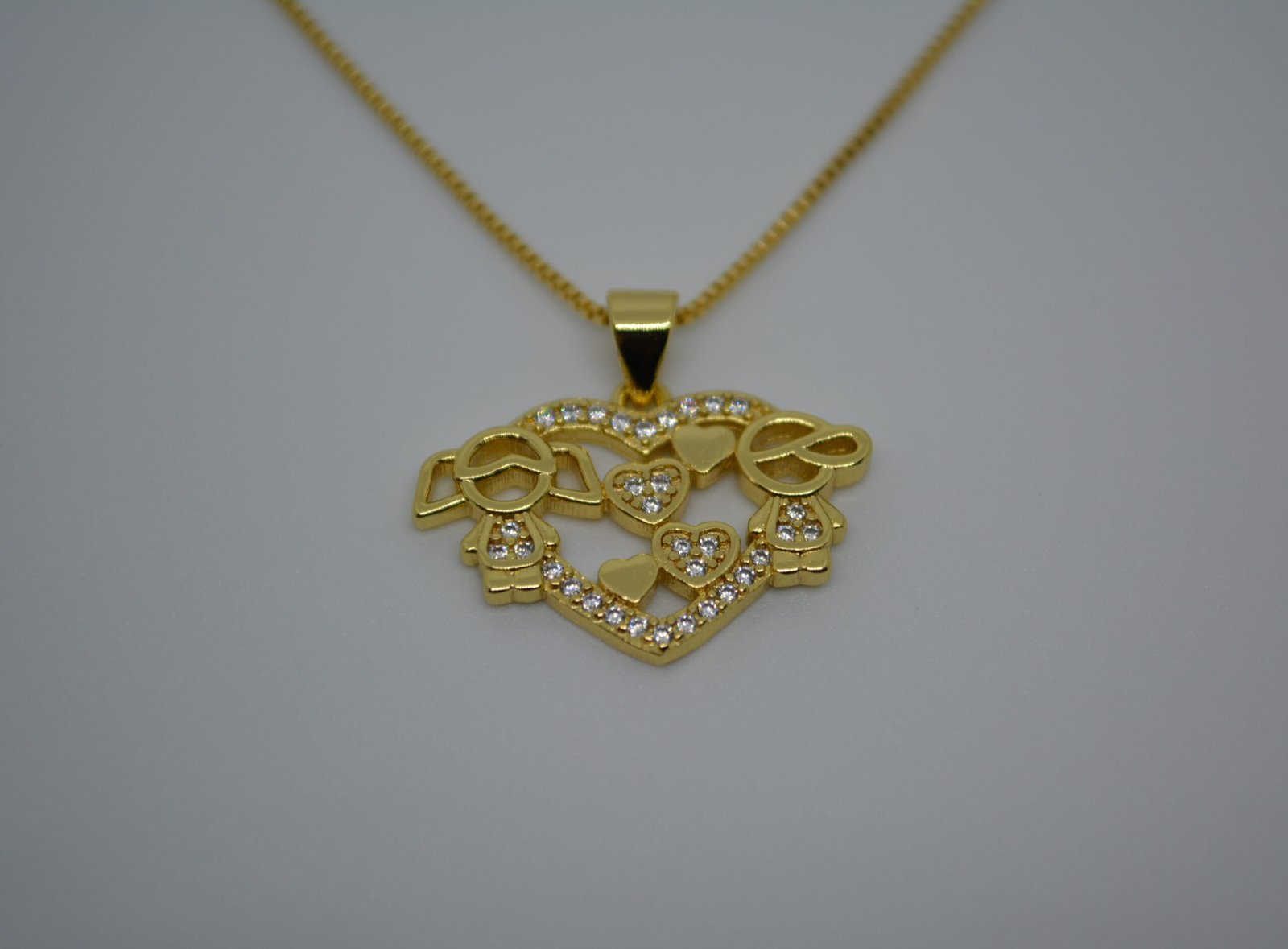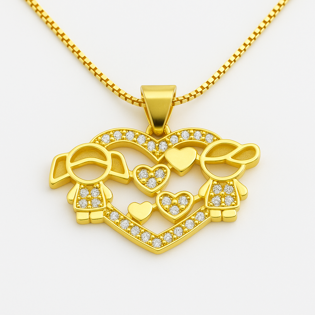 Descubra o Colar União, um acessório sofisticado que representa amor, união e família. O design elegante combina cinco corações cravejados com pedras brilhantes e figuras estilizadas de casal, criando um colar único e cheio de significado.