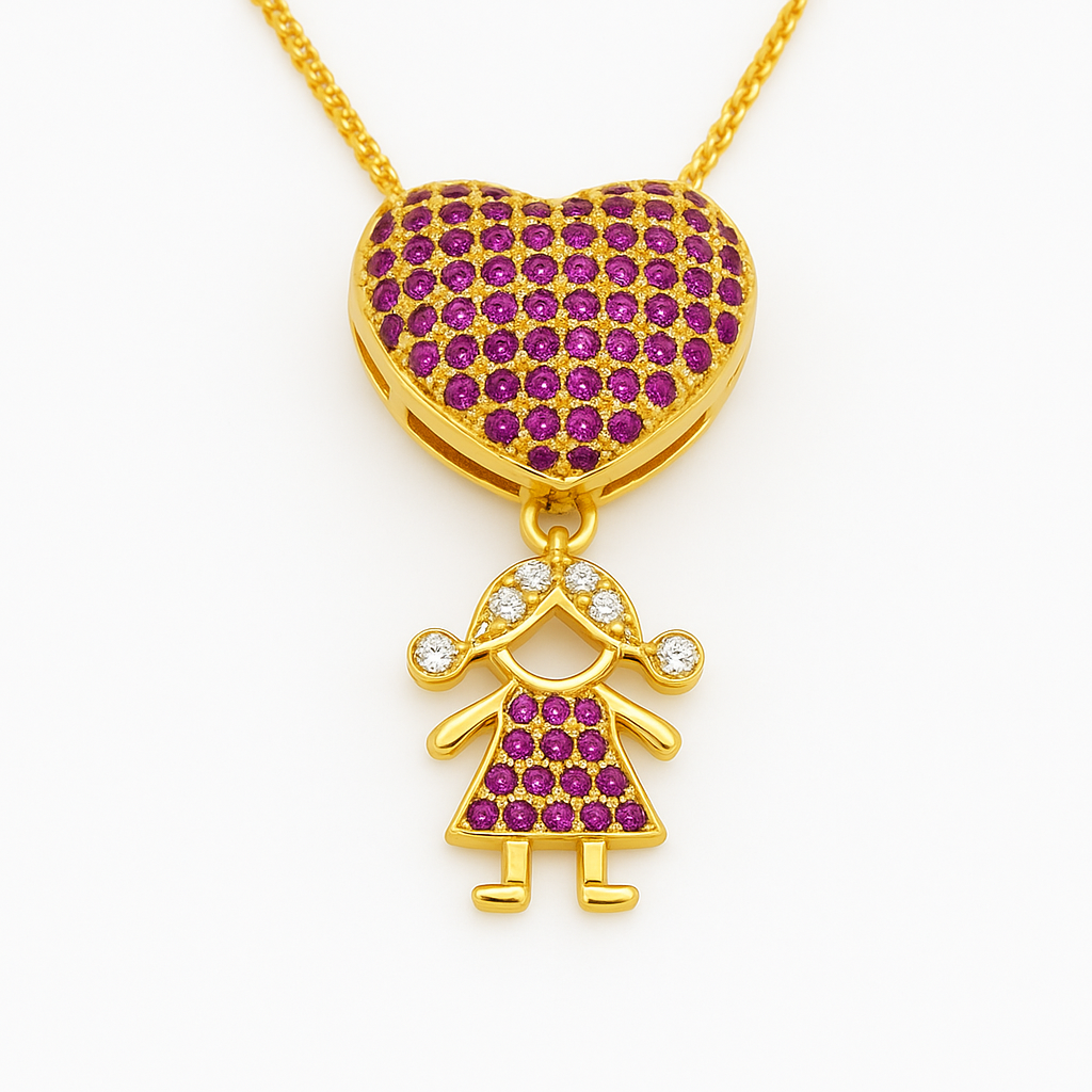 Descubra o Colar Coração Uma Menina, um acessório sofisticado que representa amor, união e família. O design elegante combina um coração cravejado com pedras brilhantes e uma menina representando sua filha ou neta, criando um colar único e cheio de significado.