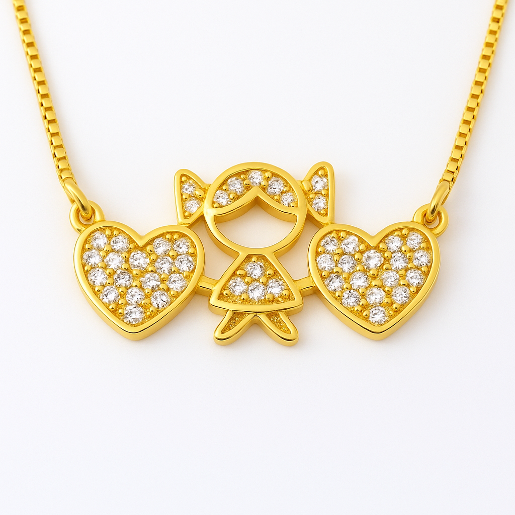 Celebre o vínculo mais puro com o Colar Laço Materno, uma joia banhada a ouro 18k que simboliza o amor em dobro por quem ilumina sua vida. Dois corações cravejados abraçam uma menina estilizada, criando uma peça emocional perfeita para mães, avós ou quem deseja guardar um símbolo de carinho perto do peito.