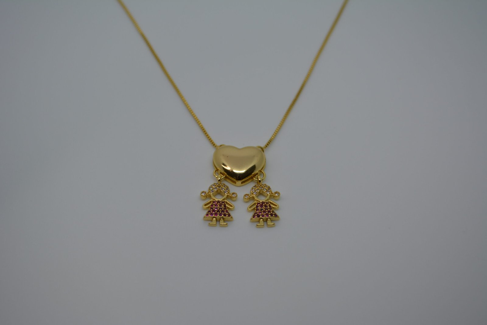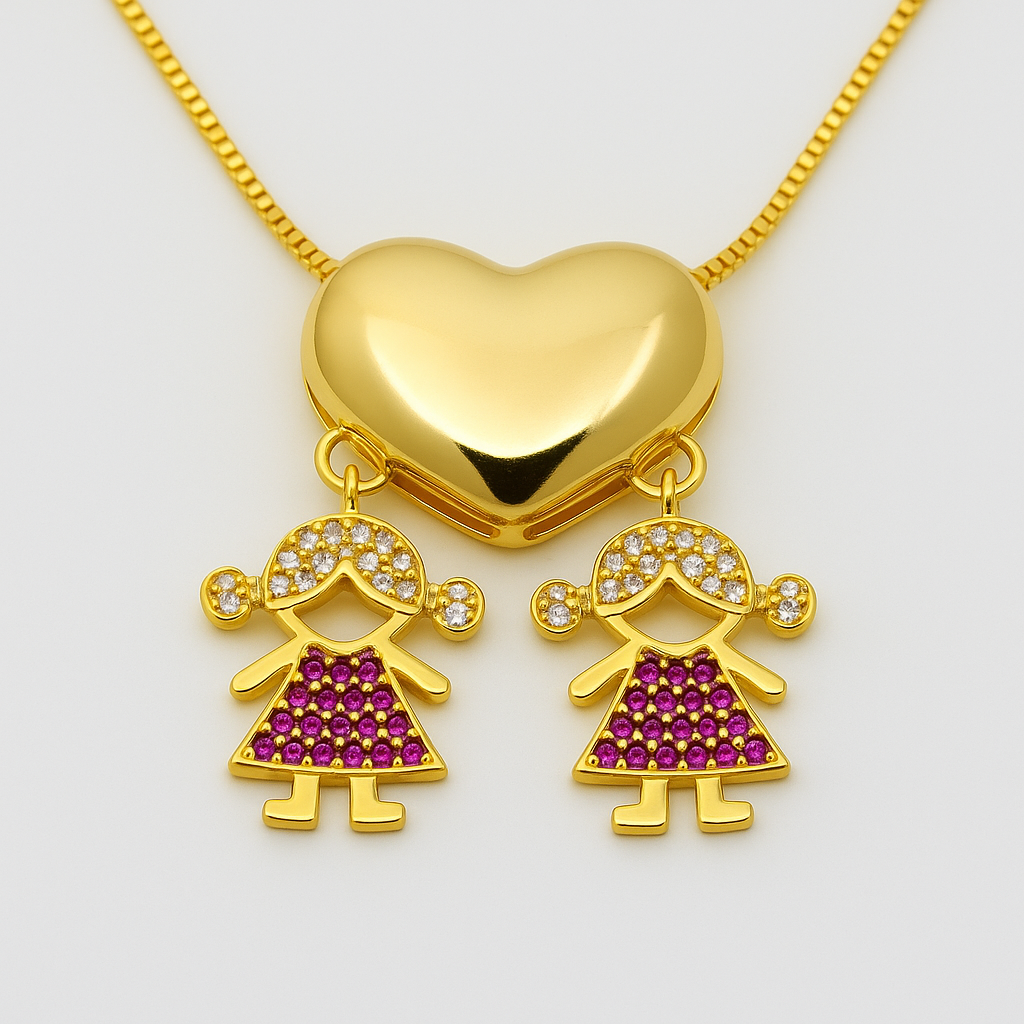 Descubra o Colar Coração Duas Meninas, um acessório sofisticado que representa amor, união e família. O design elegante combina um coração liso e duas meninas representando suas filhas ou netas, criando um colar único e cheio de significado.