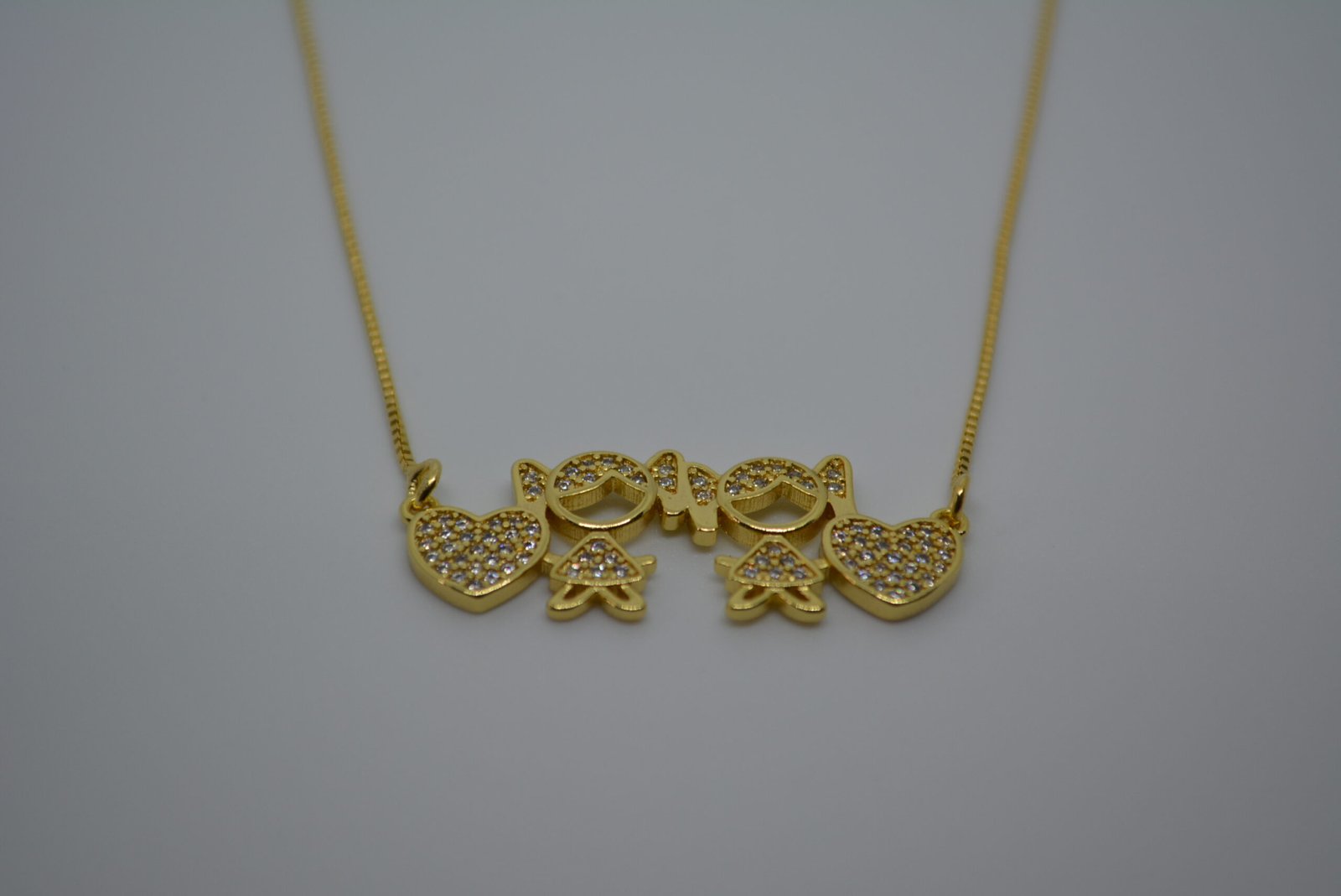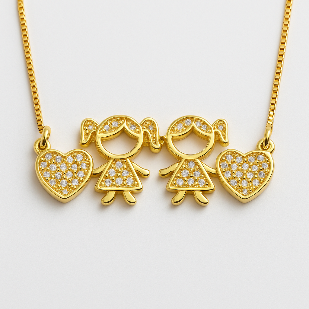 Celebre o amor pela sua família com este Colar Exclusivo– um acessório banhado a ouro 18k que simboliza laços eternos e memórias preciosas. Com dois corações cravejados de brilho intenso e duas meninas delicadamente detalhadas, esta peça é um tributo ao afeto que une mães, avós e filhos.