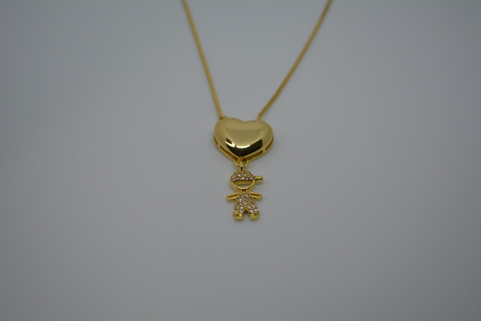 Descubra o Colar Colo, um acessório sofisticado que representa amor, união e carinho. O design elegante combina um coração liso dourado com um menino representando seu filho ou neto, criando um colar único e cheio de significado.