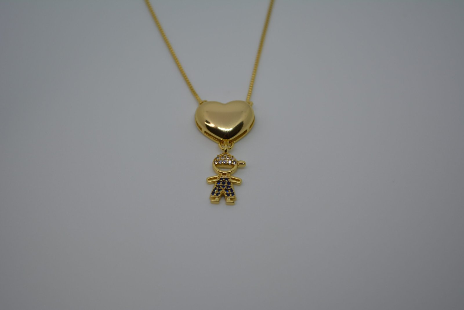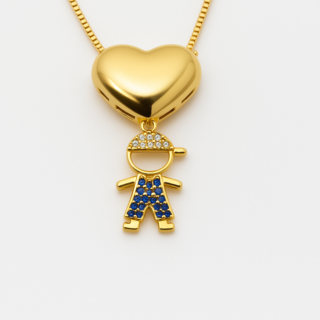 Descubra o Colar Herança, um acessório sofisticado que representa amor, união e carinho. O design elegante combina um coração liso dourado com um menino representando seu filho ou neto, criando um colar único e cheio de significado.