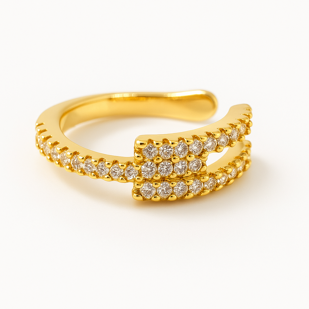 Revolucione seu visual com o Fake Piercing Prisma, uma joia banhada a ouro 18k que traz o impacto de um piercing triplo, sem necessidade de perfuração. Com três fileiras cravejadas de zircônias reluzentes, este acessório é perfeito para quem deseja um look moderno e arrojado com total liberdade.