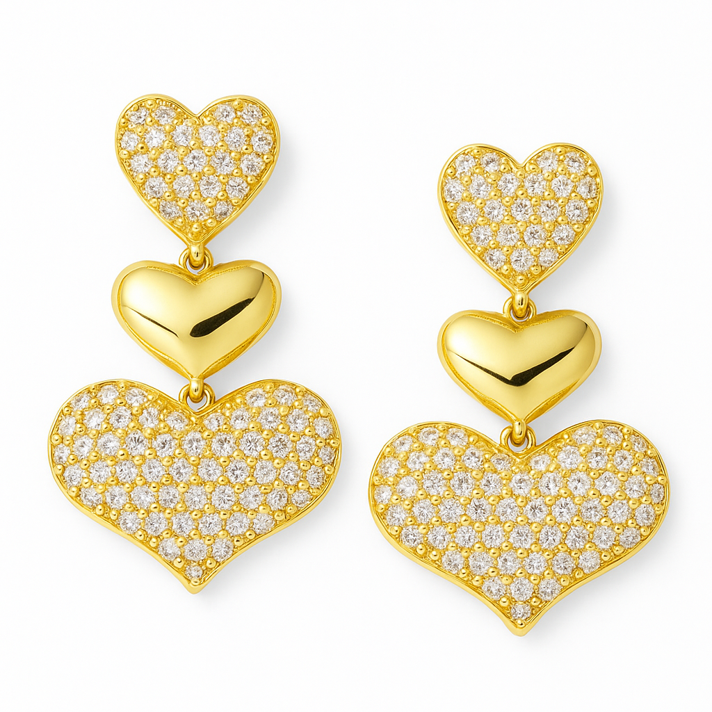 Cada brinco apresenta três corações: um coração com cravação de zirconias no topo, um coração liso e brilhante no meio e um coração maior, também cravejado na parte inferior. O acabamento dourado adiciona calor e elegância. Banhado a ouro 18k.