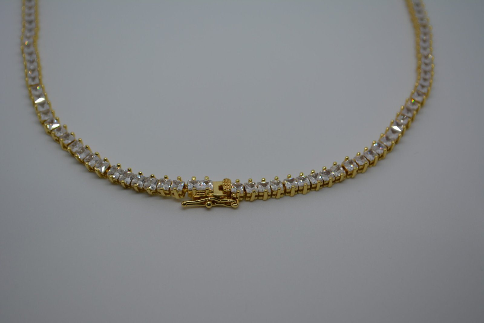 Eleve seu estilo com este deslumbrante Colar Riviera uma peça sofisticada que combina o brilho intenso do metal banhado a ouro 18k com a beleza reluzente das pedras zircônia. Perfeito para noites especiais ou para adicionar um toque de glamour ao seu dia a dia!