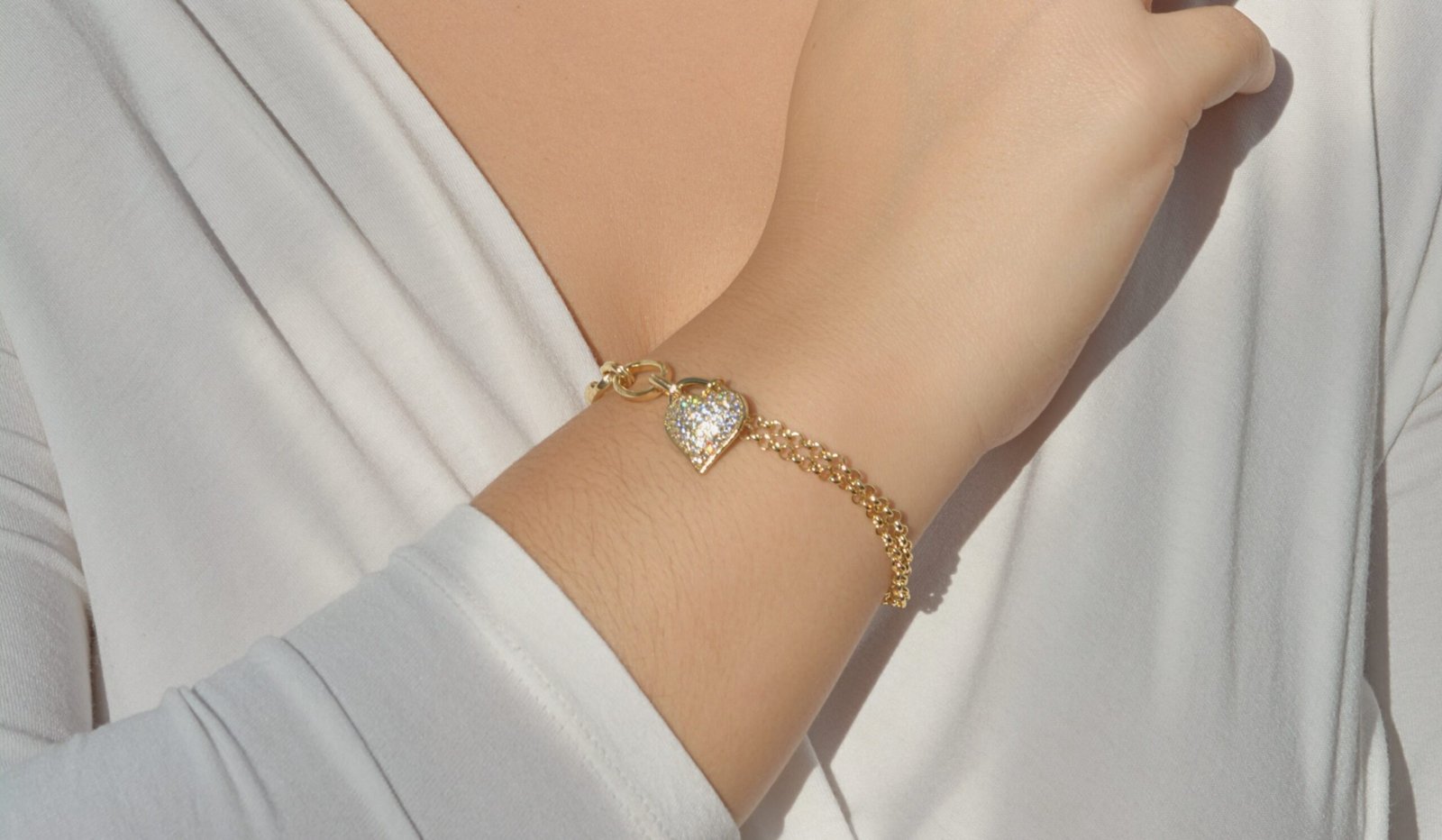 Pulseira Elos e Coração Cravejado, um acessório refinado que une o brilho das pedras cravejadas com um design clássico e cheio de significado.